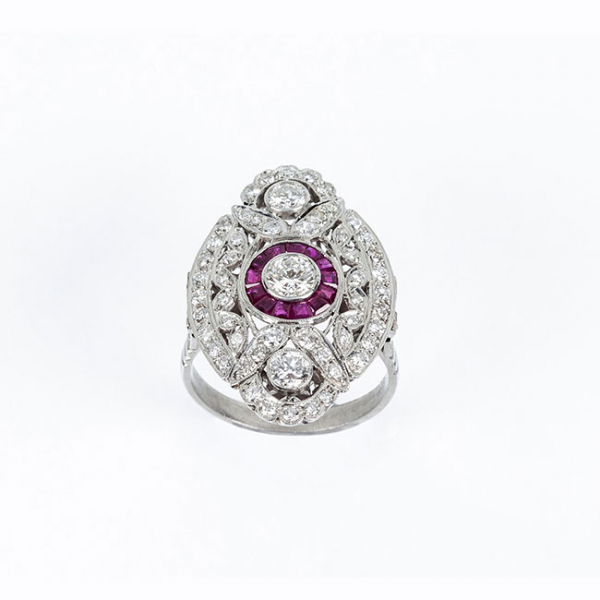 Bella sortija lanzadera de estilo 'art-decó' en montura de platino. Centro en 'ojo de perdiz', con un limpio y blanco diamante central, talla brillante moderna, orlado en banda de rubíes finos calibrados en motivo geométrico calado, oval, decorado con bandas de limpios y blancos brillantes, con vistas grafiladas