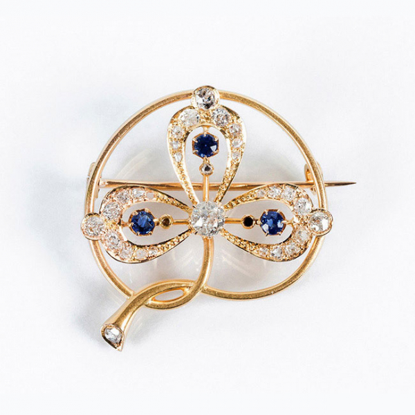 Bello alfiler de autor, época modernista, en sólida montura de oro amarillo 18 K, con motivo de trébol con un limpio y blanco diamante central, talla brillante antigua, diamantitos y zafiros azules.