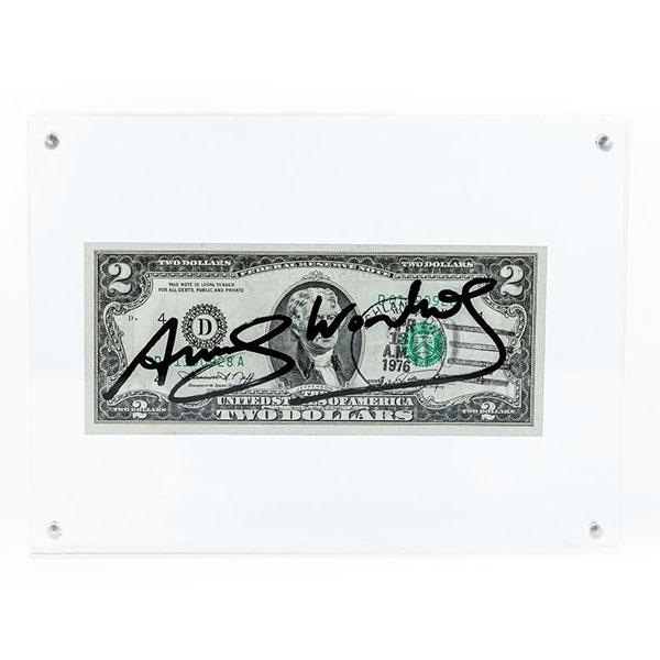 Billete de 2$ americanos firmado por el artista ' pop art ' Andy Warhol (Pittsburgh; 6 de agosto de 1928 - Nueva York; 22 de febrero de 1987). Nº D01190928A del año 1976.