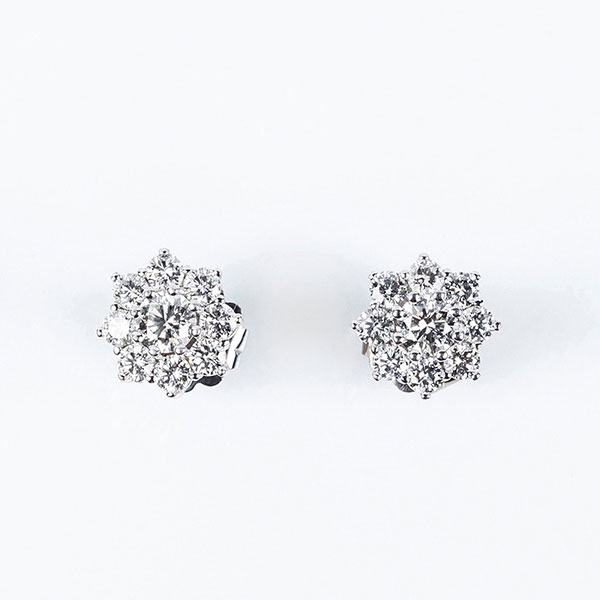 Pendientes en oro blanco con centro y orla de limpios diamantes, talla brillante, en garras.
