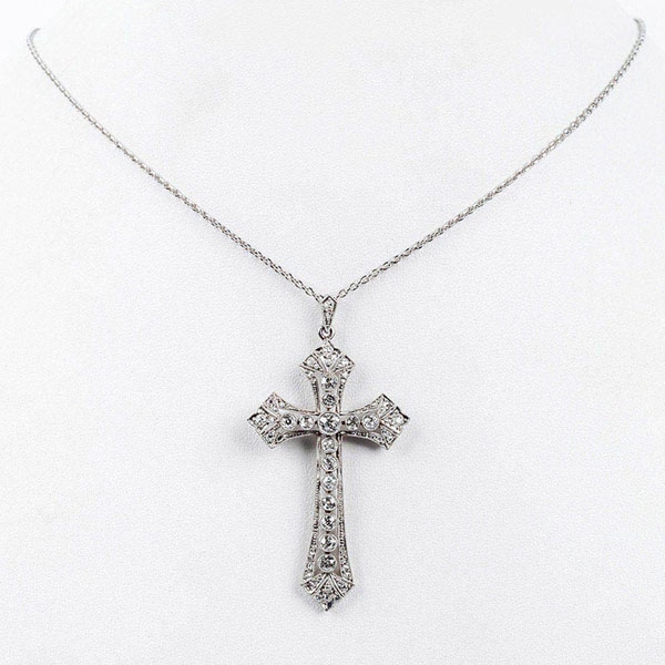 Bella cruz antigua (55 x 30 mm) realizada en platino con blancos diamantes talla antigua y diamantitos (2.00 ct aprox), en decoración calada y grafilada.