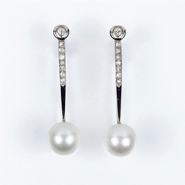 Pendientes largos 'decó', formados por barrita antigua de oro rosa en disminución, decorada en fila de diamantes, con chatón en volante calado con un diamante talla antigua, en vistas grafiladas de platino y rematada por una bonita perla australiana (11.7 mm, a estrenar).