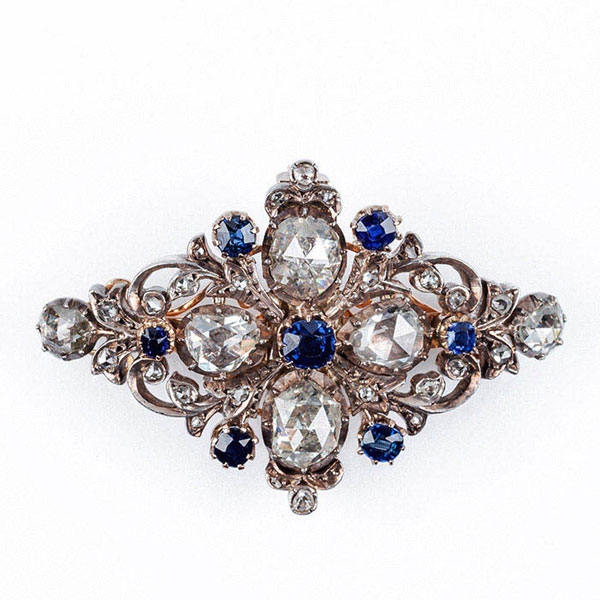 Bello alfiler-colgante s XIX, en oro rosa, con planta de cruz, formada por grandes diamantes, talla rosa, en perilla, orlada de diamantitos y zafiros finos azules, y vistas de plata