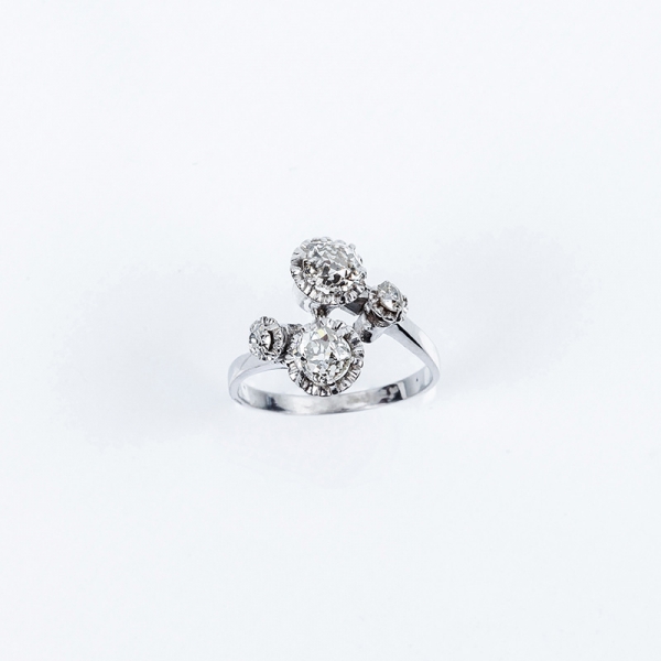 Sortija 'tu y yo' vintage, en montura de oro blanco, con dos blancos diamantes talla antigua y otros dos de menor tamaño, en garras de ilusión, al final de cada brazo.