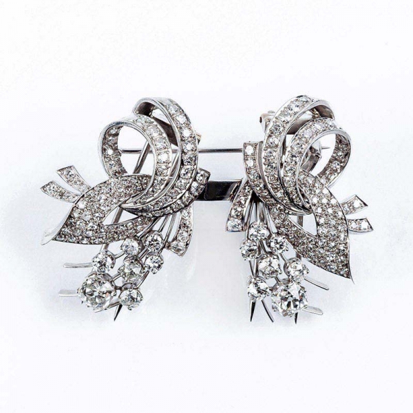 Alfiler-doble clip-pendientes, antiguos, en montura de platino, con motivo en ramillete cuajado de limpios y blancos diamantes, talla brillante antigua, destacando los dos centrales, y motivo en lazos cuajados de blancos diamantes talla 8/8.