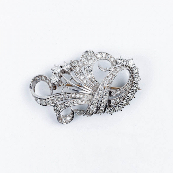 Elegante broche-alfiler vintage en oro blanco, con motivo de ramo vegetal en bandas onduladas con blancos diamantes, talla brillante, y tres centros con brillantes mayores, en garras.