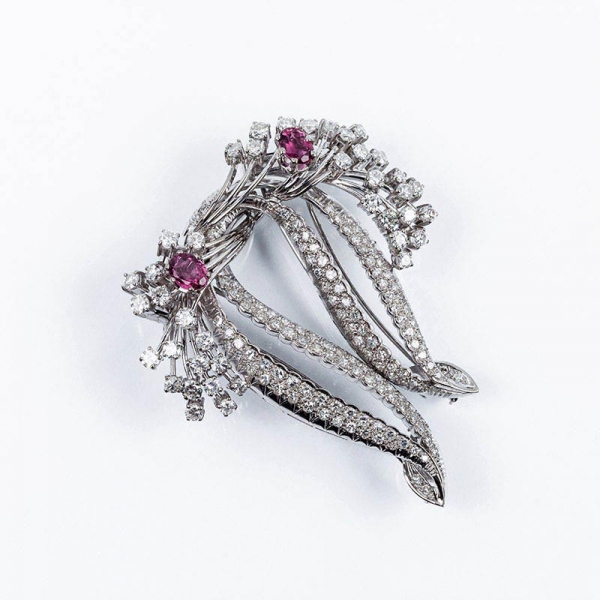 Elegante broche de doble clip desmontable en montura de oro blanco o platino. Diseño calado de doble racimo cuajado de limpios y blancos diamantes, talla brillante, con centro de turmalina rosa, oval, en garras, sobre motivo de hoja doble, en pavé de diamantes.