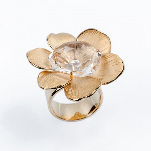 Original sortija de autor en sólida montura de oro amarillo de brazo ancho. Motivo de flor con pétalos matizados y centro de diamante talla rosa coronada, de 0,25 ct aprox, bajo un cristal de roca facetado, en garras.