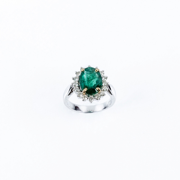 Sortija en sólida montura de oro blanco con esmeralda oval de intenso color, en garras de oro amarillo, orlada de limpios y blancos dimantes, talla brillante