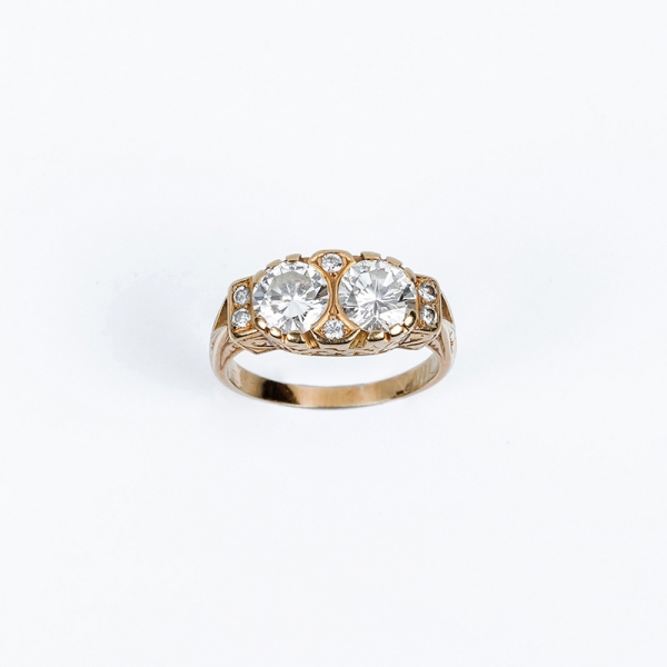 Sortija vintage con dos excelentes diamantes talla brillante moderna, y diamantitos talla brillante. Montura en oro amarillo con decoración en relieve en laterales (