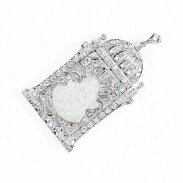 Bello colgante, antiguo, en montura de oro blanco, con relieve de la Virgen y el niño tallado en nácar, enmarcado en capilla cuajada de diamantes 8/8, con vistas en decoración grafilada.