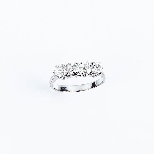 Anillo vintage en oro blanco con frente en banda de tres limpios y blancos diamantes, talla brillante, separados por parejas de diamantes (3 bts: 1.20 ct, 4 bts: 0.20 ct aprox.
