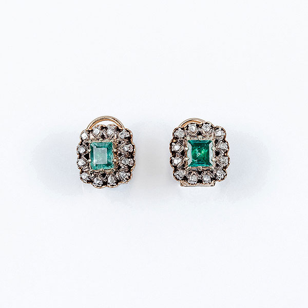 Pendientes de estilo isabelino, en montura de oro rosa con bellas esmeraldas en su talla y orla de diamantitos sobre vistas de plata.