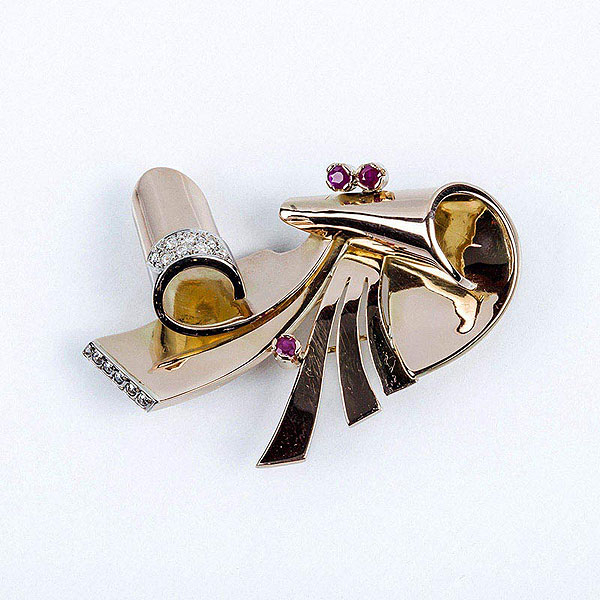 Bello alfiler 'Chevalier', años 40-50, en montura de oro rosa en forma de lazada, decorada con bandas de diamantes talla brillante antigua, en vistas de oro blanco, y 3 rubíes en garras.