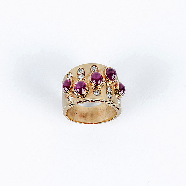 Sortija ancha en oro amarillo con fila ondulada de cabujones de rubíes finos ovales en chatón, y bandas en fila de limpios y blancos diamantes, talla brillante.