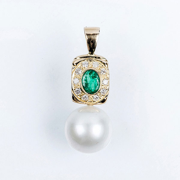 Colgante largo en oro amarillo con bonita esmeralda talla oval (1.50 ct aprox), orlada de blancos diamantes talla brillante, y una gran perla australiana esférica, de 14 mm.