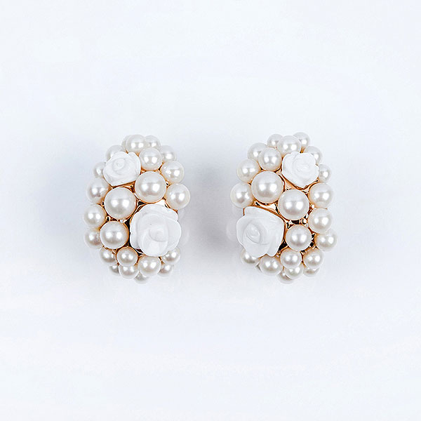 Pendientes de alta joyería, de la firma MIMI, en sólida montura calada de oro rosa, con frente curvado, cuajado de perlitas cultivadas y dos flores talladas en ágata blanca.