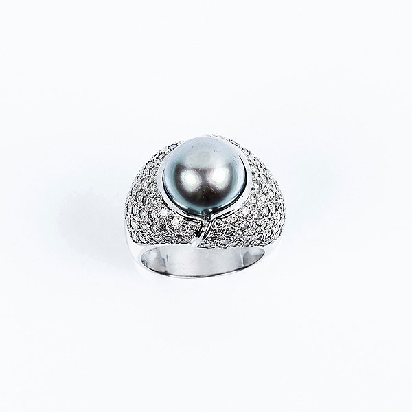 Sortija de alta joyería en montura maciza de oro blanco, diseño 'bombé' en pavé de limpios diamantes talla brillante, con una bella perla gris de Tahití de 12 mm.