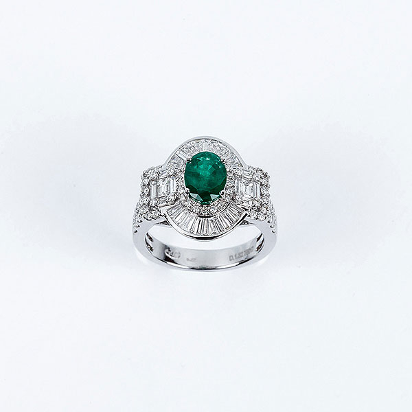 Bella sortija en oro blanco con esmeralda oval y doble orla de limpios y blancos diamantes talla brillante y trapecio.