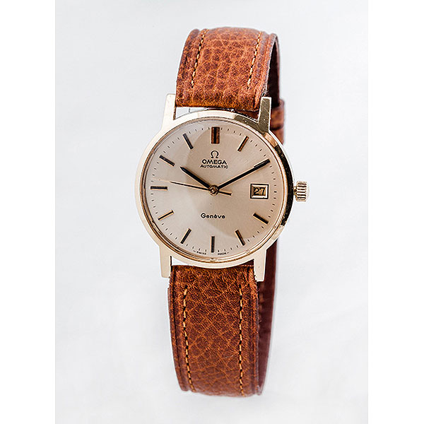 Reloj caballero vintage, suizo OMEGA, años 60-70, en sólida caja original de oro amarillo, 35 mm, con tapa roscada. Movimiento automático nº 34763673, calibre 1481. Calendario. Segundero central.