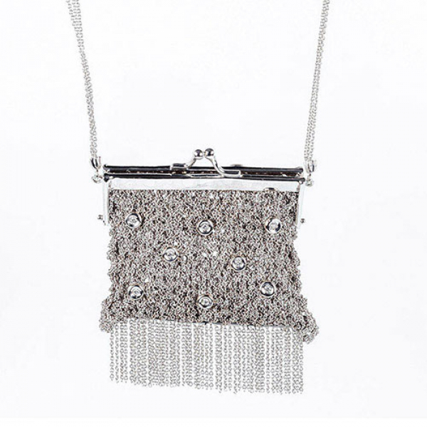 Delicado bolsito en malla de oro blanco decorado con blancos y limpios diamantitos, talla brillante, salteados y montados en chatón (8 bts: 0.14 ct aprox).