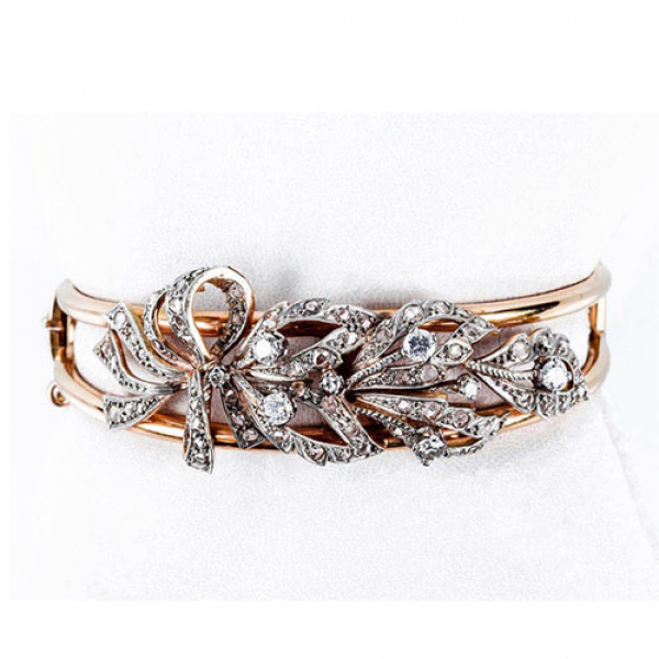 Brazalete esclavo vintage, en sólida montura 'esqueleto' de oro amarillo, con centro floral decorado con blancos diamantes, talla brillante, en garras y bandas onduladas de diamantes en vistas grafiladas de oro blanco. Peso total pedrería: 1.45 ct aprox.