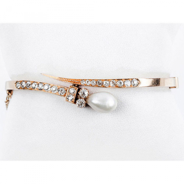 Brazalete esclavo antiguo en oro rosa, diseño de doble brazo con motivo central de blancos diamantes talla 'cojín', y una bella perla natural en perilla ( 8 x 12 mm ).