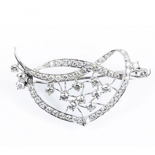 Alfiler en montura calada de oro blanco, con motivo de lazada en fila de limpios y blancos diamantes, talla brillante, con centro en racimo de diamantes talla brillante, en garras.