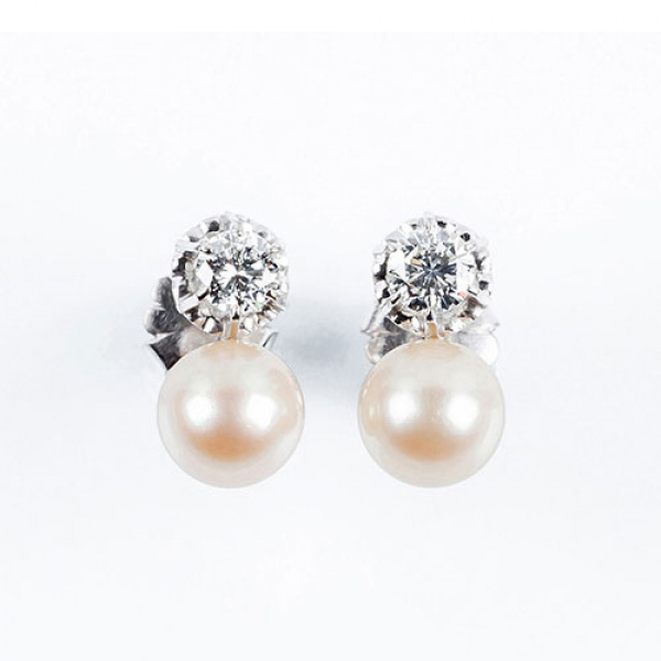 Pendientes vintage 'tú y yo', en oro blanco, con perla cultivada de 9 mm, coronada por un limpio y blanco diamante, talla brillante, en garras de ilusión.