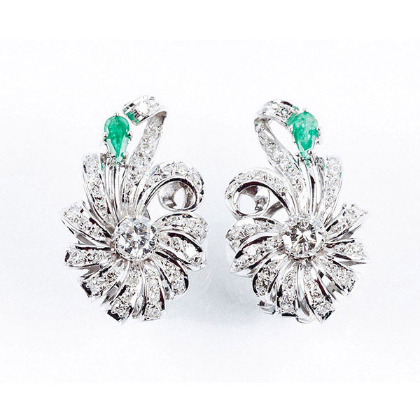 Pendientes vintage en oro blanco, diseño floral calado con un limpio y blanco diamante, talla brillante, central, en garras, y bandas radiales onduladas, en fila de diamantitos, con detalle de esmeraldita en perilla. Peso 2 bts: 0.80 ct (características estimadas: color H, pureza: VS-SI) y 60 dts 8/8: 0.50 ct aprox.