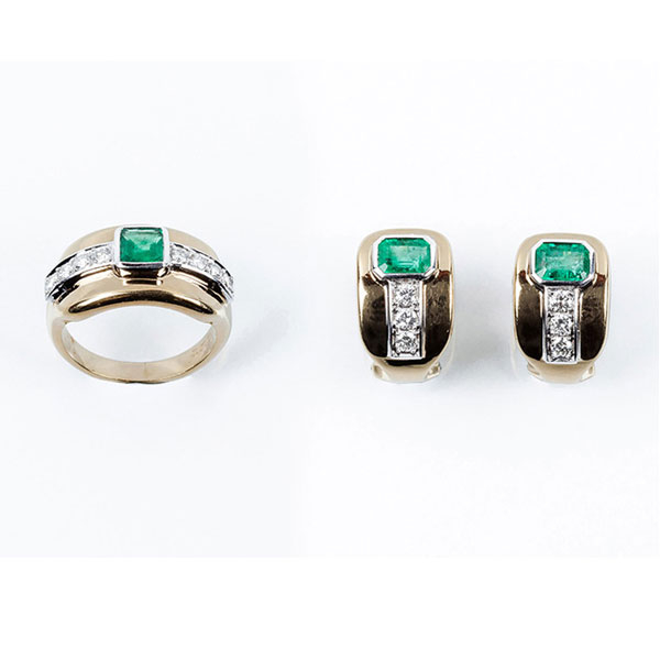 Juego de sortija y pendientes en oro amarillo, con centro de esmeralda colombiana en su talla, en chatón, sobre banda en fila de limpios y blancos diamantes, talla brillante, en vistas de oro blanco.