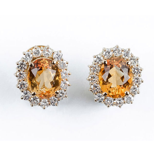 Bellos pendientes en oro amarillo con topacio amarillo, talla oval, orlado de limpios y blancos diamantes, talla brillante