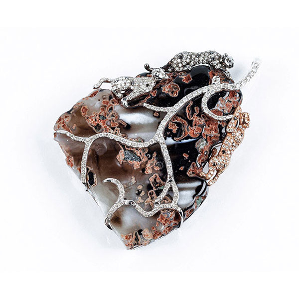 Original gran colgante de autor, sobre placa triangular de ágata marrón semi-pulida, montada en oro blanco con diseño vegetal en filas de blancos diamantes talla brillante, con tres pequeños leopardos decorados en pavé de diamantes blancos (234 bts: 2.00 ct aprox. Características estimadas: color H-light brown, pureza SI-I1) y negros.