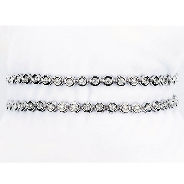 Dos puleras 'rivière' en oro blanco, con fila de limpios y blancos diamantes, talla brillante, en chatón, que también forman una gargantilla.
