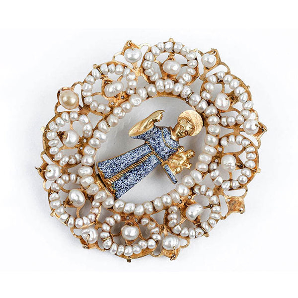 Colgante oval s XVIII-XIX con San Francisco y el Niño, en oro, esmaltado en azul, con orla calada de perlitas naturales aljófares.