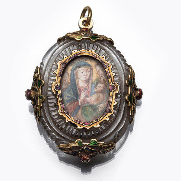 Dije-relicario antiguo, de estilo barroco, probablemente, s. XVI, realizado en oro y cristal de roca. Con miniaturas de estilo renacentista de Virgen con Niño y San Juan Bautista.