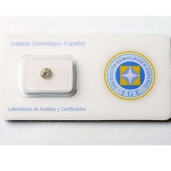 Diamante natural, talla brillante. Certificado IGE (Instituto Gemologico Español): Color K, pureza VS2, talla y proporciones correctas, simetría buena y pulido muy bueno.
