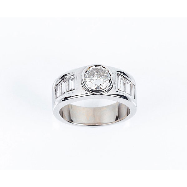 Anillo en sólida montura de oro blanco con un diamante natural, talla brillante de 1.40 ct aprox. (características estimadas: color H, pureza VS, excelente talla moderna, fluorescencia débil) en chatón, flanqueado por bandas de limpios y blancos diamantes baguettes a cada lado (6 dts: 0.90 ct aprox. H-VVS).