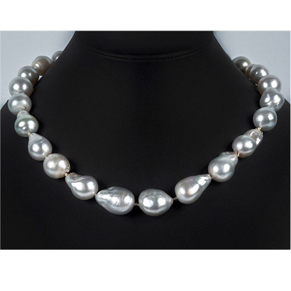 Collar formado por 24 bellas y grandes perlas australianas, barrocas, de grueso cultivo y bello oriente irisado. En disminución de 22/16 a 16/11 mm. Con cierre a doble aro de oro blanco pulido y matizado.