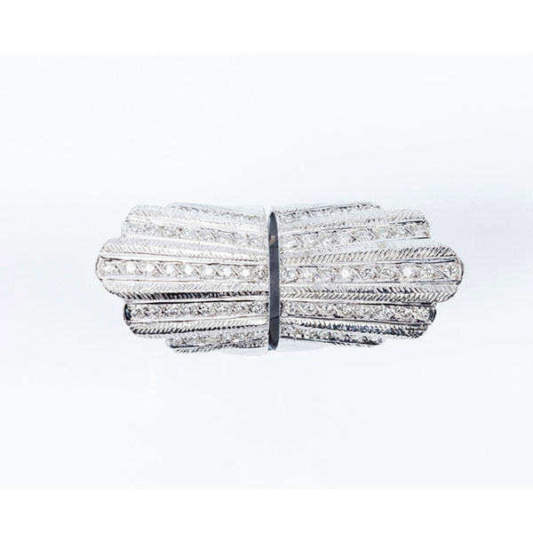 Pareja de sortijas semi-lanzaderas vintage, de estilo 'art-decó' en sólida montura de oro blanco formadas por cresta en disminución de franjas paralelas de limpios y blancos diamantes, talla brillante, en decoración burilada (74 bts: 1.80 ct.
