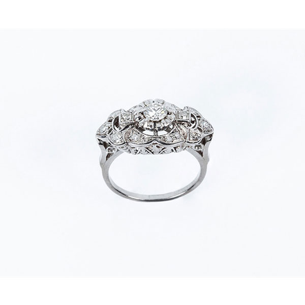 Sortija "art decó" en montura de platino u oro blanco, con un limpio y blanco diamante central, talla brillante de 0.22 ct aprox (características estimadas: color H, pureza VS, talla moderna)., en garras de ilusión, sobre dibujo geométrico calado cuajado de diamantes sobre vistas grafiladas.