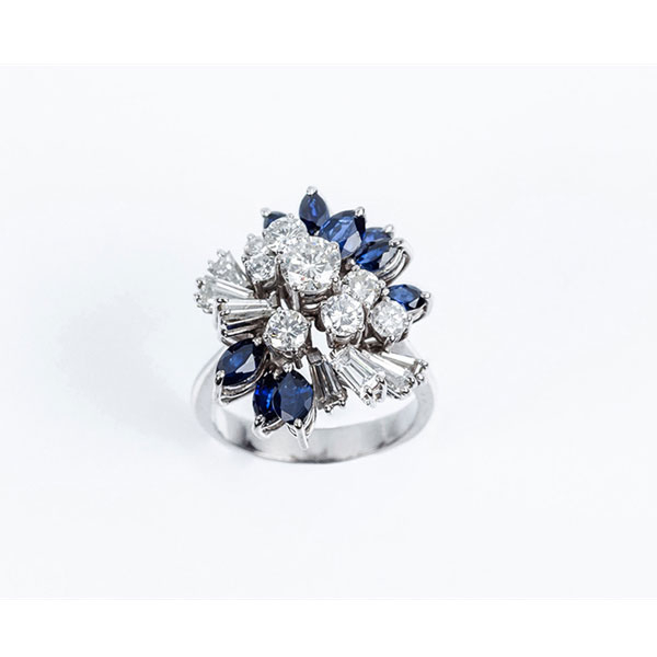 Sortija vintage de alta joyería en sólida montura de oro blanco con penacho cuajado de limpios y blancos diamantes, talla brillante, y zafiritos finos azules, en garras al aire, alrededor de un brillante central