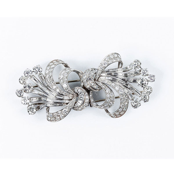 (14 bts: 5.30 ct aprox.: características estimadas: color H-J, pureza VS-VVS, talla moderna; 110 dts talla brillante antigua: 5.50 ct aprox y 69 dts baguette (falta uno): 3.50 ct aprox., características estimadas: color H, pureza VVS). Se presentan sin la pieza de unión. 44 x 42 mm cada uno. Alfiler doble completo: 82 mm