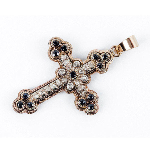 Gran cruz bizantina colgante, en oro amarillo, con frente decorado en bandas de diamantes sobre vistas de oro blanco y cuentas de ónix, en chatón.