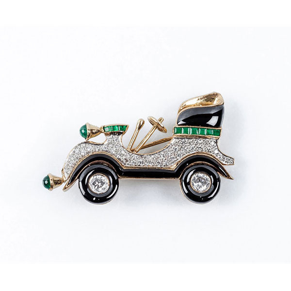 Delicado alfiler en forma de coche antiguo, realizado en oro amarillo con detalles de ónix negro, esmeraldas finas y blancos y limpios diamantes, talla brillante, en pavé, sobre vistas grafiladas de oro blanco.