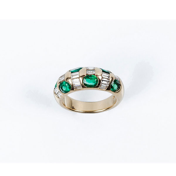 Sortija de alta joyería en sólida montura de oro amarillo, con frente curvo, decorado con bellas esmeraldas talla oval y bandas de limpios y blancos diamantes baguette.