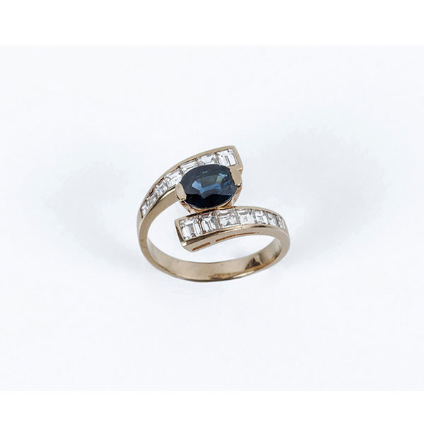 Sortija bilabial en oro amarillo, con un zafiro fino azul, talla oval, entre brazos en banda de limpios y blancos diamantes 'carré' .