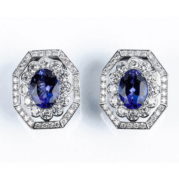Grandes pendientes de alta joyería, en montura de oro blanco, con centro de zafiro sintético azul, en talla oval, y doble orla calada en fila de limpios y blancos diamantes, talla brillante, formando un marco octogonal (88 bts: 5.60 ct aprox.