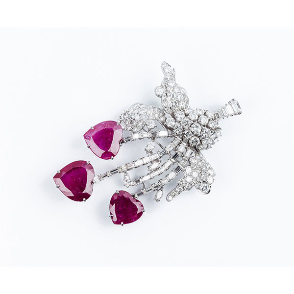 Elegante colgante-alfiler de alta joyería en sólida montura de oro blanco, formado por motivo vegetal cuajado de limpios y blancos diamantes, talla brillante y brazos en bandas onduladas de diamantes baguette rematados en grandes rubíes-rubelitas naturales, talla corazón