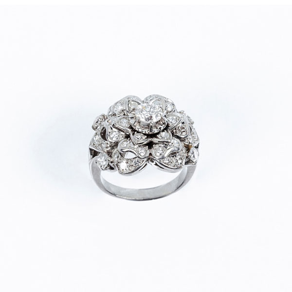 Elegante sortija vintage en montura de platino, con un diamante talla brillante central, en garras de ilusión, sobre flor de pétalos con diamantes talla 8/8 y talla brillante (1 bte: 0.44 ct aprox.
